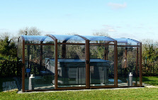 C’est l’abri de spa rectangulaire au dimensions ajustables en fonction de votre jacuzzi ou spa de nage tout en longueur. Sa construction est classique avec les pans droits et une toiture en forme de voûtes. Le coulissement permet de dégager les éléments vers l’extérieur.